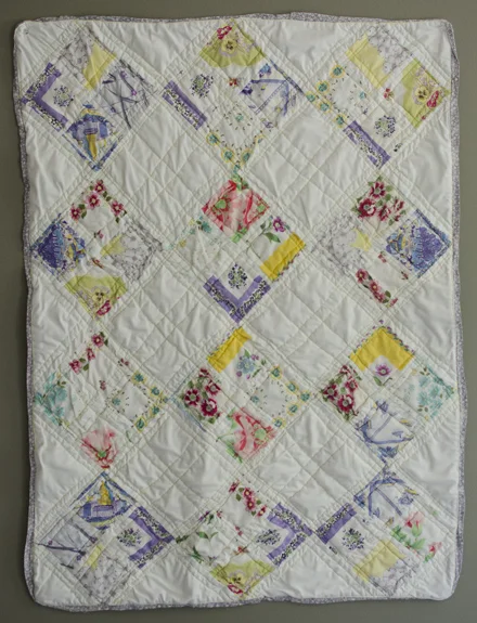 For this project I started with a board "Design {Quilts}". On this board, I add images of any quilts that I find beautiful. I use my gut to lead me to what I am really attracted to. Next, I create another board "Quilt {Baby Kate}". On this board, I compile quilt designs from my "Design {Quilts}" board that would work with my handkerchiefs and sewing skills. I am not a seamstress. I know how to work a sewing machine and that's about it! Finally, I choose a single design that speaks to me and use that as my inspiration for my project. This part of my process takes days, sometimes weeks.